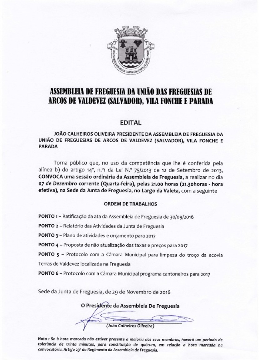 Realiza-se no proximo dia 07/12/2016 uma sessão ordinária da Assembleia de Freguesia, pelas 21.00h na Sede da Junta de Freguesia, no Largo da Valeta.
